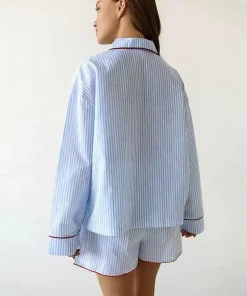 100% Cotton Long Sleeve Night Suits Women Cotton Pyjamas Striped Print Long-Sleeve Shirt and Shorts Summer Pj Set