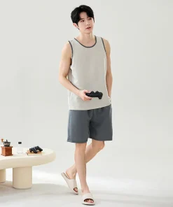 LongD Men’s Pajama Tank Top and Shorts 100% Polyester Home Wear Casual Breathable Soft Comfortable Gentle on the Skin