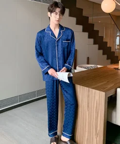 Men’s High-End Fashion Ice Silk Pajamas Loose Home Clothing Set Plus Size 100% Polyester Thermal Yarn Dyed Knitted Winter Quick