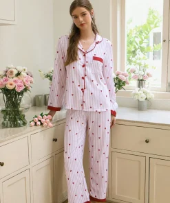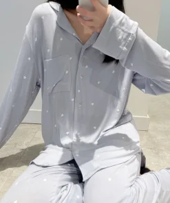 Cute Women’s Modal Pajama Set Heart Pattern Long Sleeve Loungewear Loose Fit Plus Size 2-Piece Sleepwear Cardigan Pajama Set