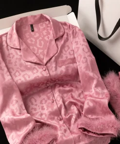 HUOYOUNG Design Pyjamas Set 2 Pcs Women’s Feather Pijamas Mujer Soft Jacquard Leopard Print Satin Silk Pajamas Set Women