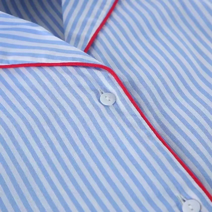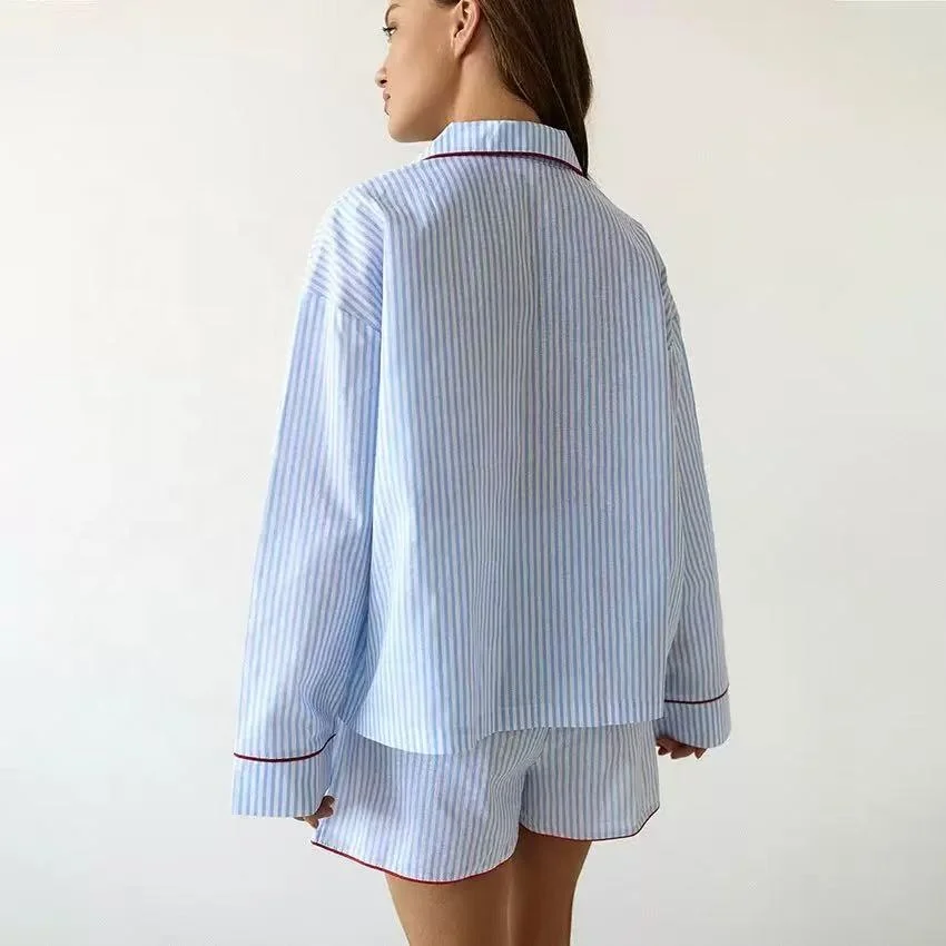 100% Cotton Long Sleeve Night Suits Women Cotton Pyjamas Striped Print Long-Sleeve Shirt and Shorts Summer Pj Set