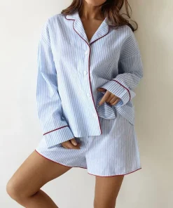 Be the first to review “100% Cotton Long Sleeve Night Suits Women Cotton Pyjamas Striped Print Long-Sleeve Shirt and Shorts Summer Pj Set” Cancel reply