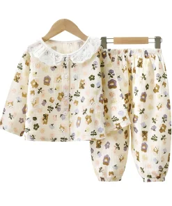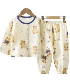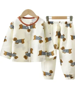 Summer New Boys’ & Girls’ Home Suit Double Cotton Yarn Pajamas with Waffle Lace & Animal Pattern for Baby’s Sleepwear