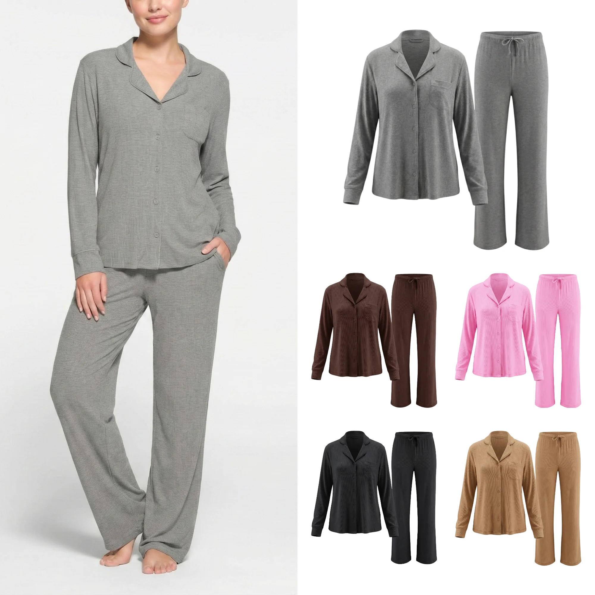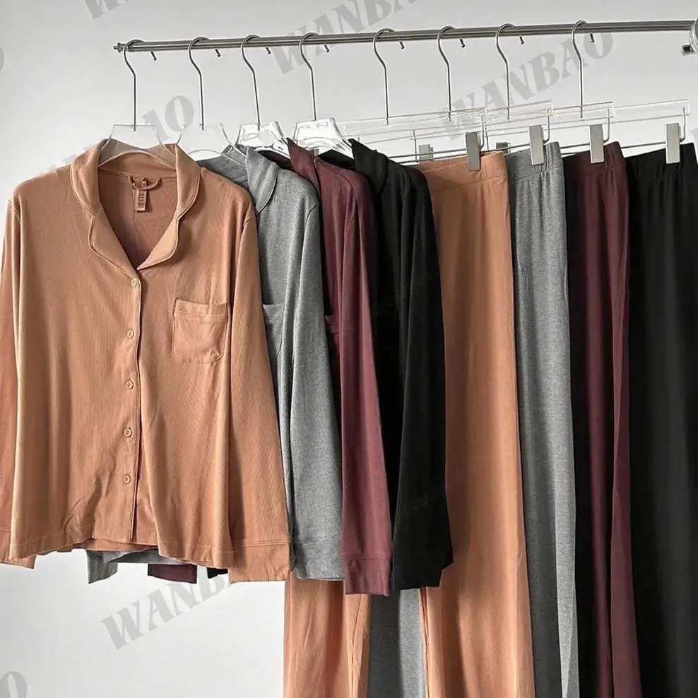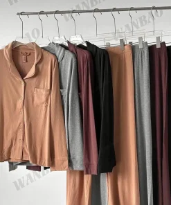 Women’s Ultra Soft Knitted Modal Ribbed Pajama Set Long Sleeve Button Notch Collar Top & Pants Quick Dry Breathable Nightwear